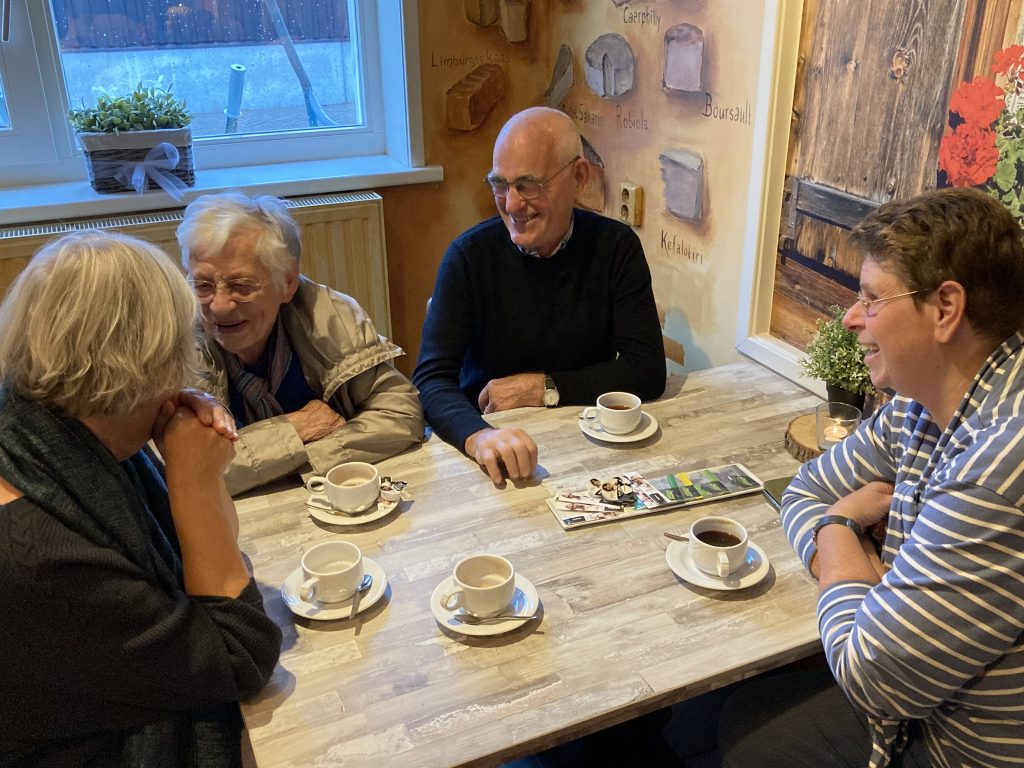 Aanvankelijk was dat grijs en nat. Langs het Grevelingenmeer zag je geen verschil tussen water en lucht, maar in de bus was de stemming opperbest. Die werd nog beter bij de eerste stop, op geitenfokkerij De Mèkkerstee, waar we werden getrakteerd op heerlijke koffie met dito gebak.