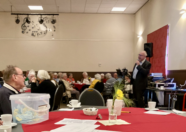 Verderop in de wereld is het allesbehalve leuk, maar juist dat maakt ontspanning op zijn tijd heel belangrijk. Dus hield KBO-Huijbergen op woensdag 18 oktober haar jaarlijkse Ontspanningsmiddag. Deze keer nam zanger John Wils uit Bergen op Zoom het muzikale element voor zijn rekening en daar slaagde hij met zijn warme stem en uitgekiende repertoire voortreffelijk in. De zeventig aanwezige leden hebben van zijn optreden genoten. Wij hopen binnenkort een video-impressie van deze feestelijke middag op YouTube te kunnen plaatsen. Als voorschot daarop voegen wij hieronder een fotootje toe.